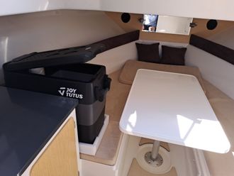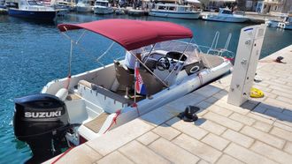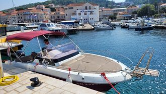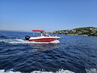 This cruiser offers a spacious cabin and a deep seating area at the stern, perfect for socializing or resting in the shade. At the bow, you’ll find a large sunbathing area, ideal for lounging and soaking up the sun. The boat also includes a bathing platform at the rear, equipped with a ladder for easy access to the sea—perfect for swimming in the crystal-clear waters of the Dalmatian coast.