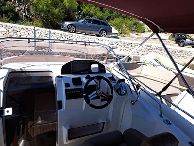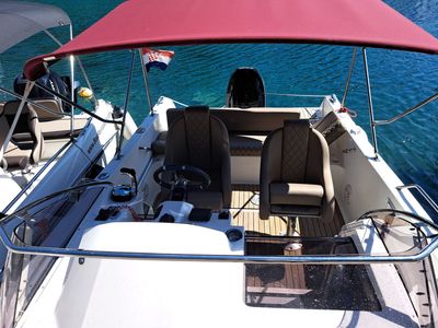 This cruiser offers a spacious cabin and a deep seating area at the stern, perfect for socializing or resting in the shade. At the bow, you’ll find a large sunbathing area, ideal for lounging and soaking up the sun. The boat also includes a bathing platform at the rear, equipped with a ladder for easy access to the sea—perfect for swimming in the crystal-clear waters of the Dalmatian coast.